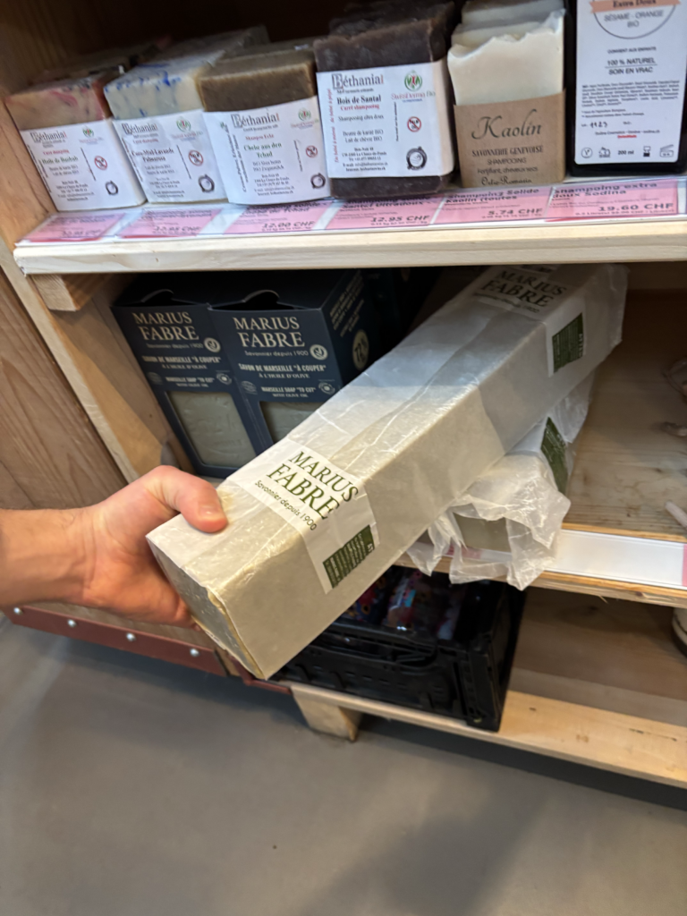 Ce que j’adore, c’est son odeur caractéristique qui embaume toute la salle de bain sans être trop forte sur la peau. Je l’utilise pour tout : le corps, le visage, les cheveux et même comme mousse à raser. C’est l’unité maximale du vrac ; ça fait trois mois que je l’ai, je n’ai coupé que deux tranches d’un centimètre, donc ça tient une éternité.